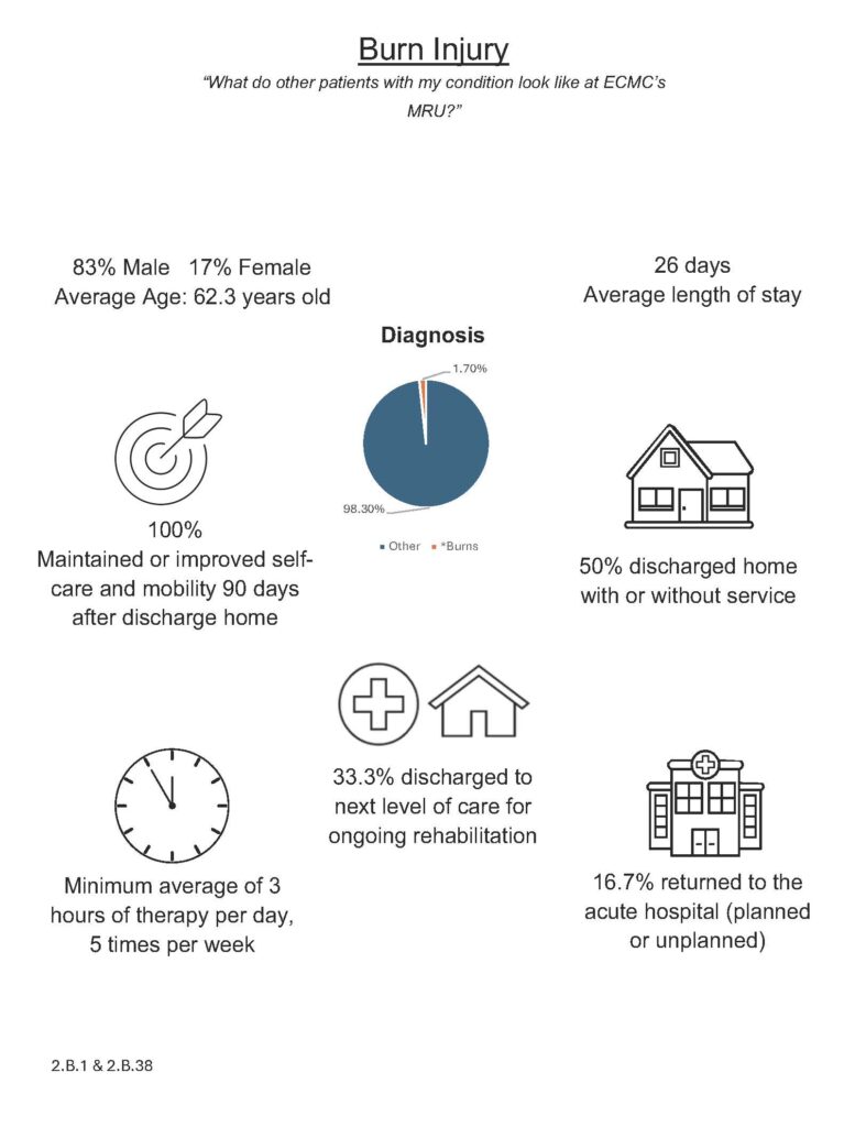 ECMC treats patients 18 years and older with injuries and illnesses that are some of the most challenging in the nation with a patient case mix index of 1.46, consistently at or higher than the national average of 1.43. ECMC is committed to helping patients achieve the highest possible level of physical, functional, and cognitive independence after an injury or illness, of adults by providing optimal, safe, effective, and reliable care. All care provided is individualized to the needs of each patient.