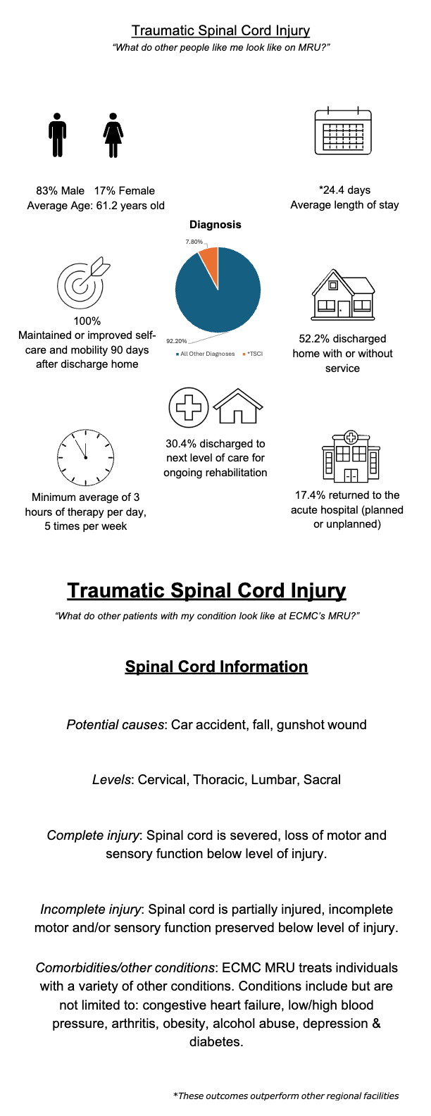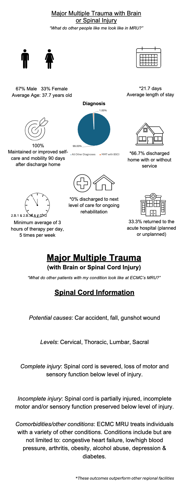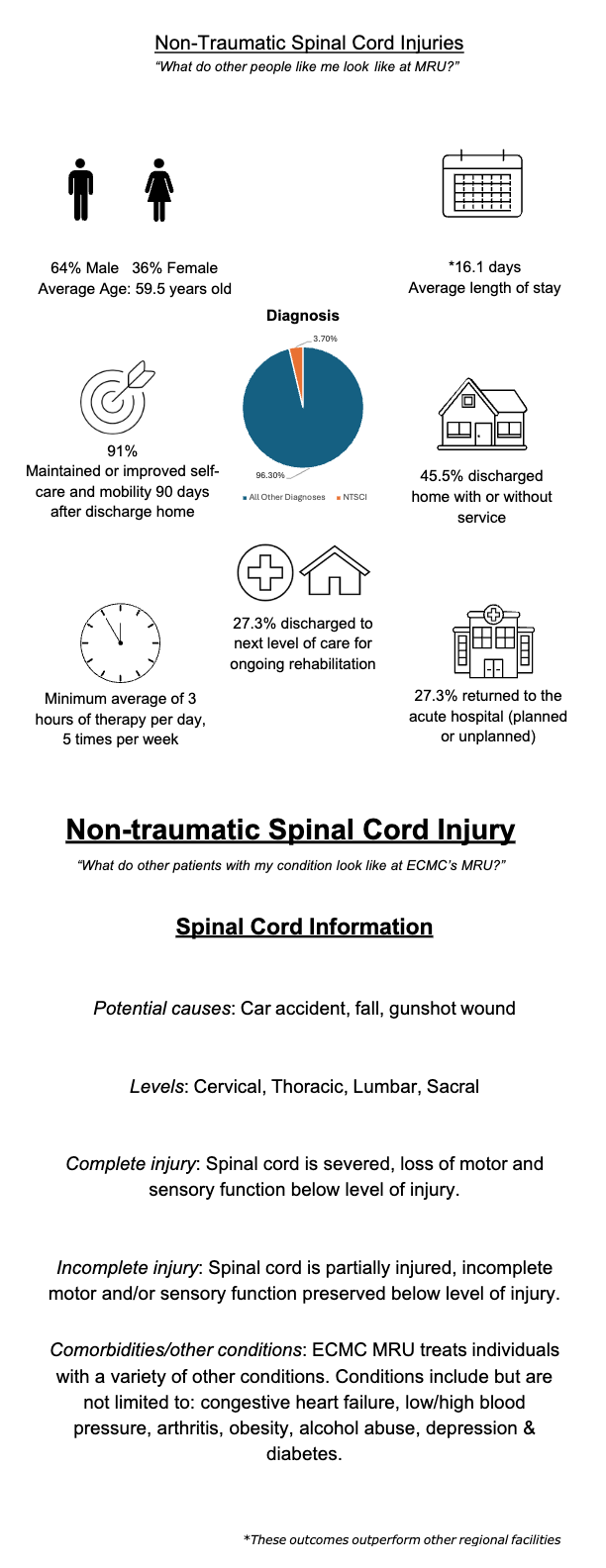 Based on data from 2025, ECMC MRU patient demographics reflect that the average age was 54.7 years old and most commonly fell between 45-64 years old, 62.7% were male, 49.5% were single, 8.5% divorced, or separated, yet 67.1% were discharged home with the assistance of family members. Ethnicity was 96.3% non-Hispanic, Latino/a, or Spanish origin, 1.7% Hispanic, Latino/a or Spanish origin and 0.3% Puerto Rican. Racial breakout was 75.6% White, 15.6% Black or African American, and 0.7% American or Alaskan Indian. The top five primary payers included No Fault 24.7%, Medicare 18.6%, Private Managed Care 16.3%, Medicare Managed Care 14.6%, Medicaid Managed Care 14.9%.